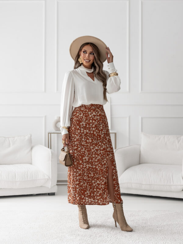 Elegancka bluzka o prostym, pudełkowym kroju. Model wyróżnia się subtelnymi zaszewkami oraz falbanami. Rękawy zakończone falbanką. Dekolt wykończony stójką