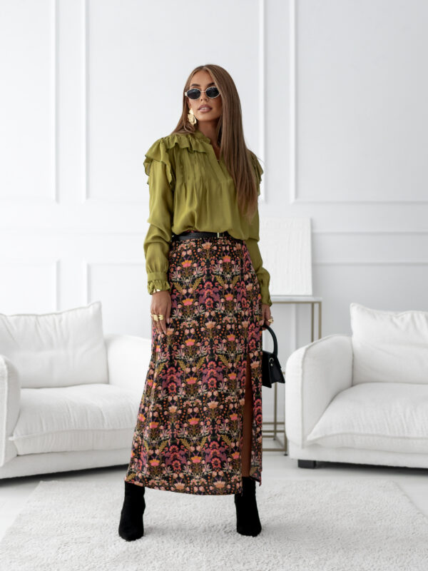 Kobieca bluzka z lekkiego materiału. Model z ozdobnymi falbanami z przodu i długim, szerszym rękawem zakończonym gumką. Idealna do eleganckich stylizacji oraz na co…
