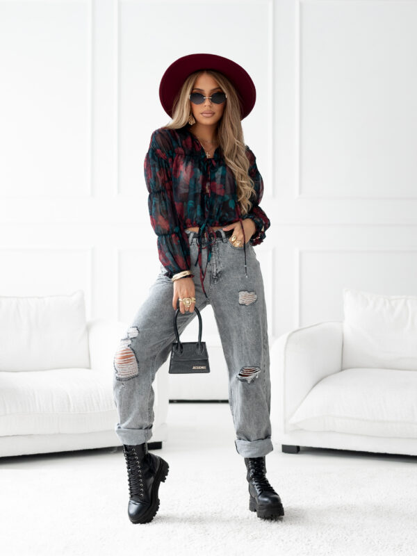 Model wykonany z szyfonu. Delikatny i półprzezroczysty materiał dodaje uroku i lekkości. Model wyróżniają ozdobne wiązania oraz przeszycia tworzące bufki. Rękawy wykończone są gumką.