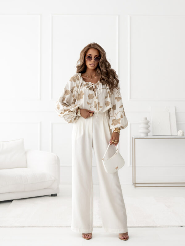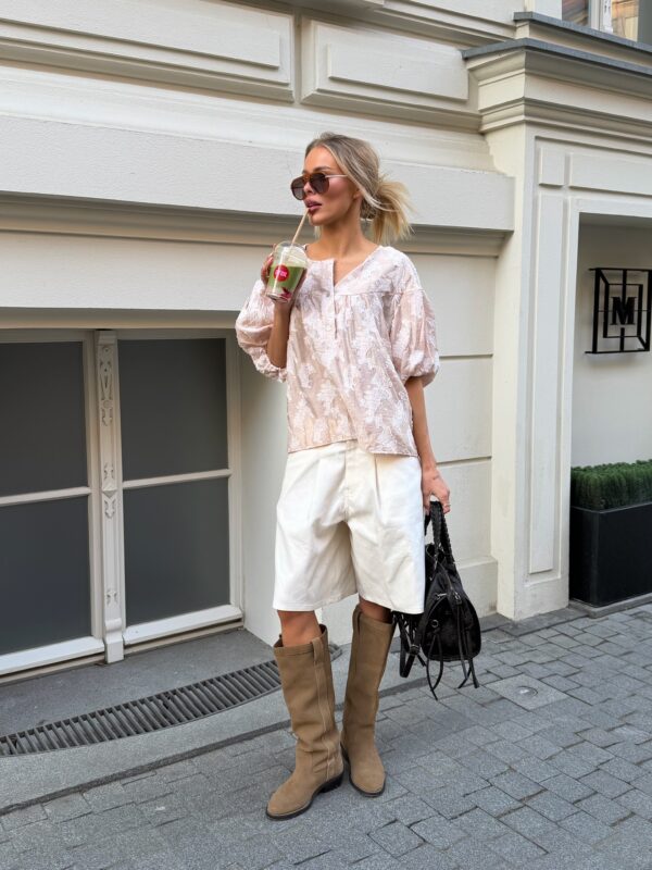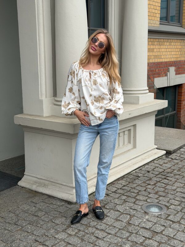Bluzka z wiskozowej tkaniny z ozdobnym haftem. Dekolt zapinany na guziki z masy perłowej. Luźny krój oraz krótsze, bufiaste rękawy nadają bluzce lekkości. Model…