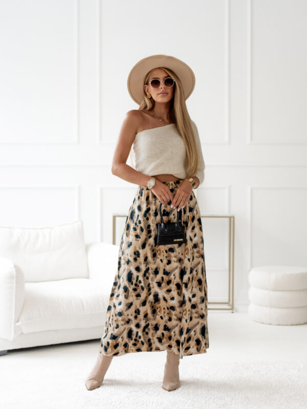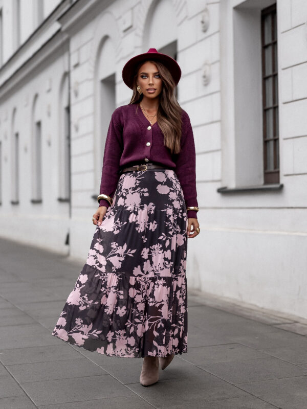 Spódnica z półtransparentnej siatki z podszewką kończącą się na linii kolan. Poziome cięcia tworzą bardzo subtelne falbany. W pasie gumka. Długość maxi.