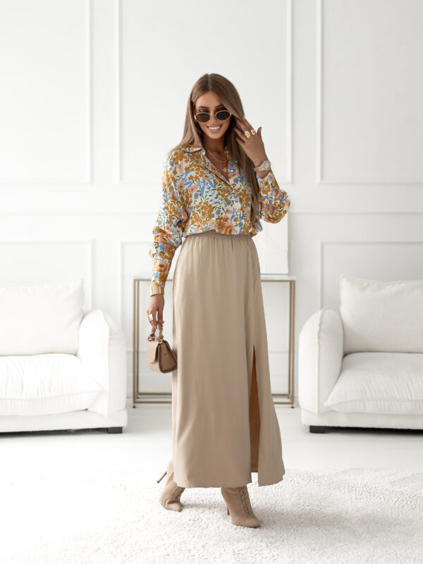 Spódnica o długości midi. Rozcięcie na jedną nogę. W pasie gumka. Posiada kieszenie.