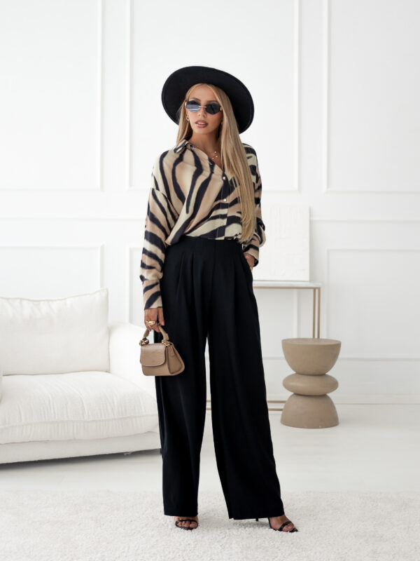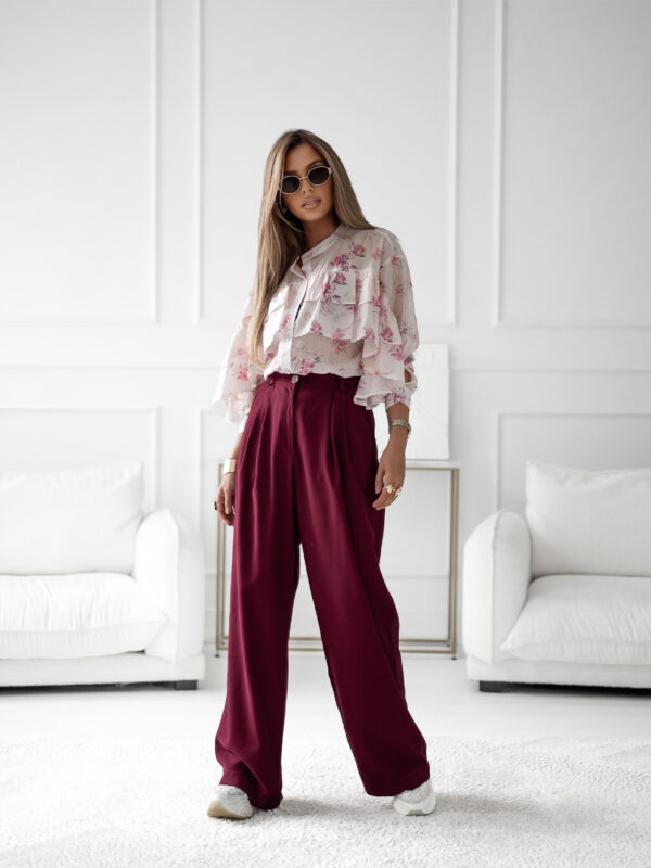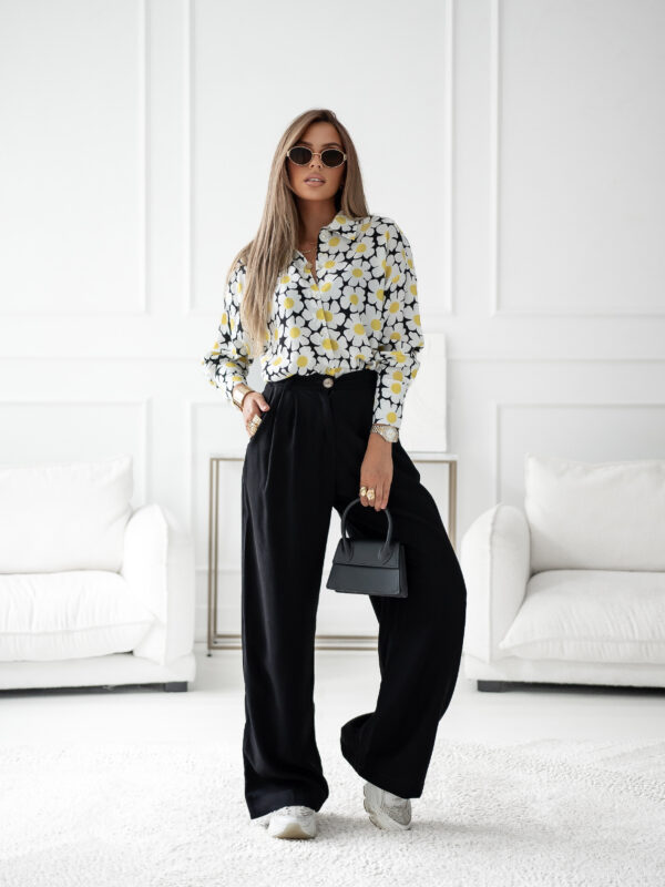 Spodnie z szerszą nogawką pozostają w trendach na ten sezon. Model o klasycznej formie - zapinany na guzik, z kieszeniami i szlufkami.
