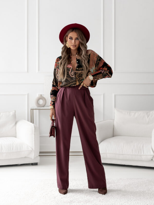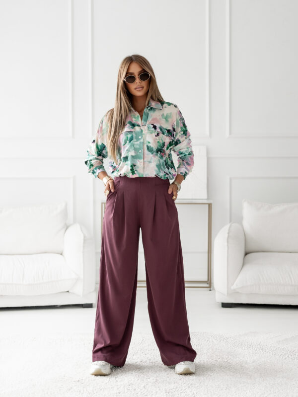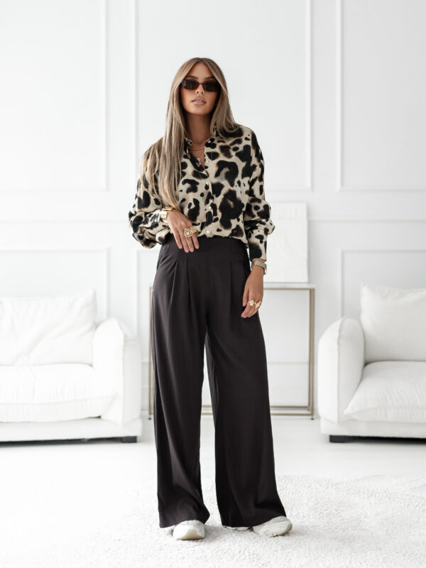 Spodnie o luźnym, prostym kroju z lejącej tkaniny . W tylnej części guma oraz kryty suwak. Zaszewki optycznie wydłużają nogi.