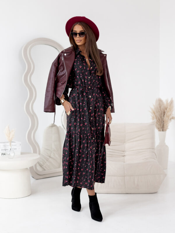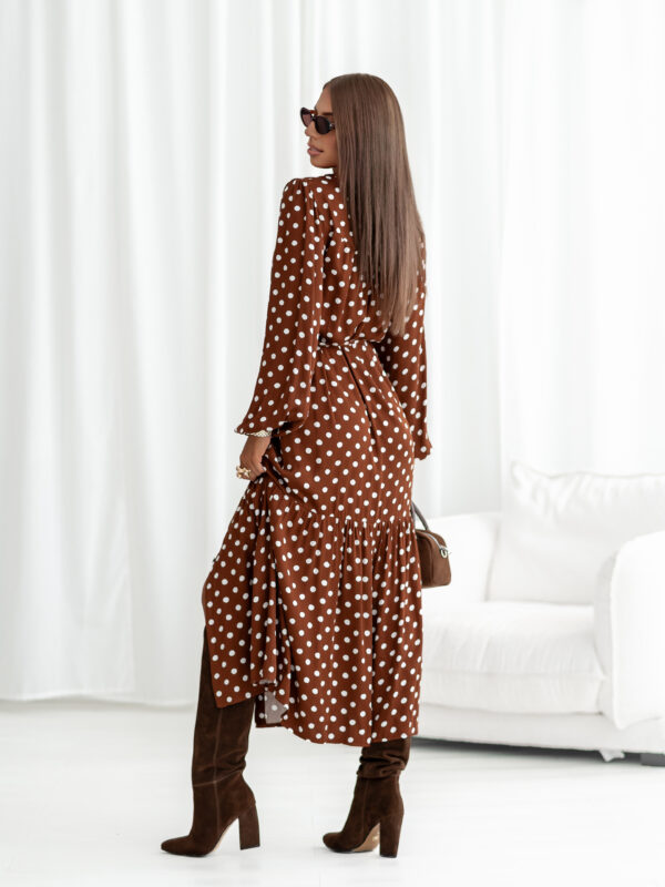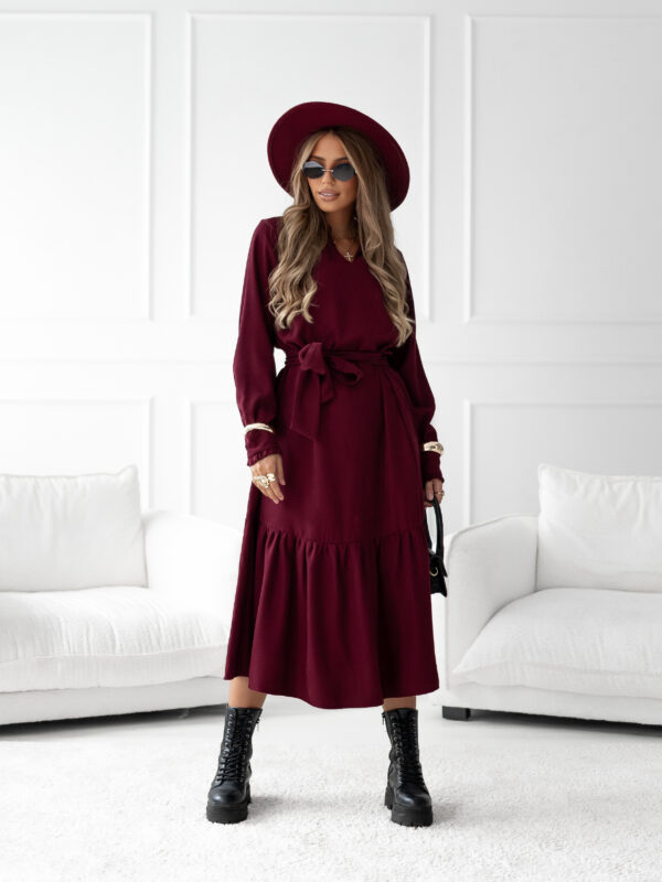 Sukienka o długości midi, z dekoltem w kształcie litery V. Model z długim rękawem zakończonym lekką bufką. Falbana zdobi dół sukienki. Zapinana po długości…