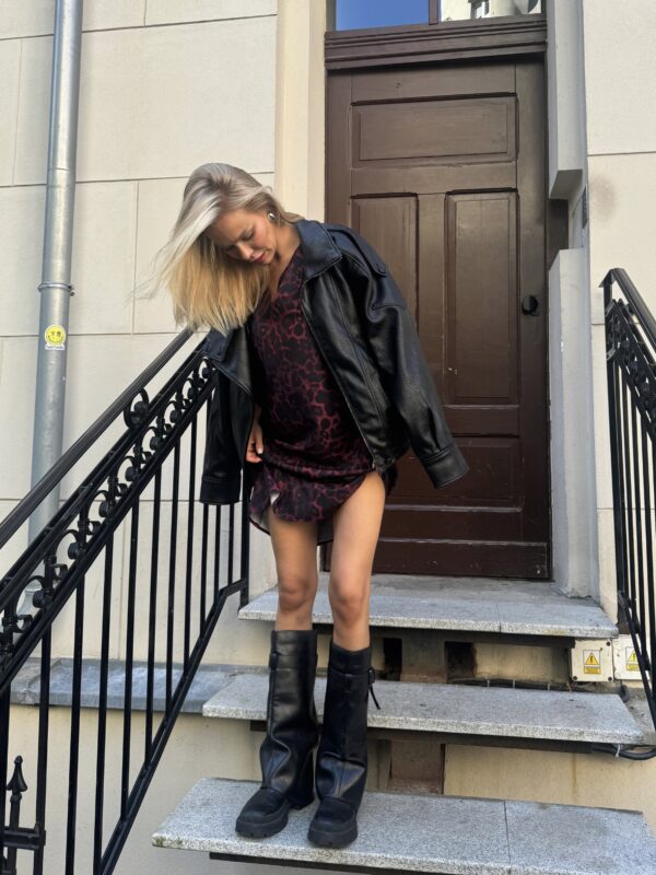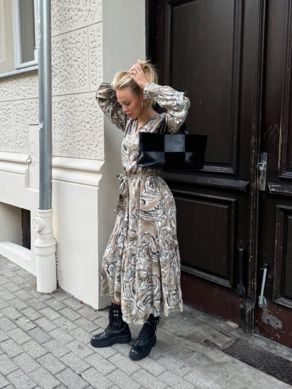Sukienka o długości midi, z dekoltem w kształcie litery V. Pasek dołączony osobno z możliwością przewiązania w talii. Rękawy zakończone są mankietem zapinanym na…