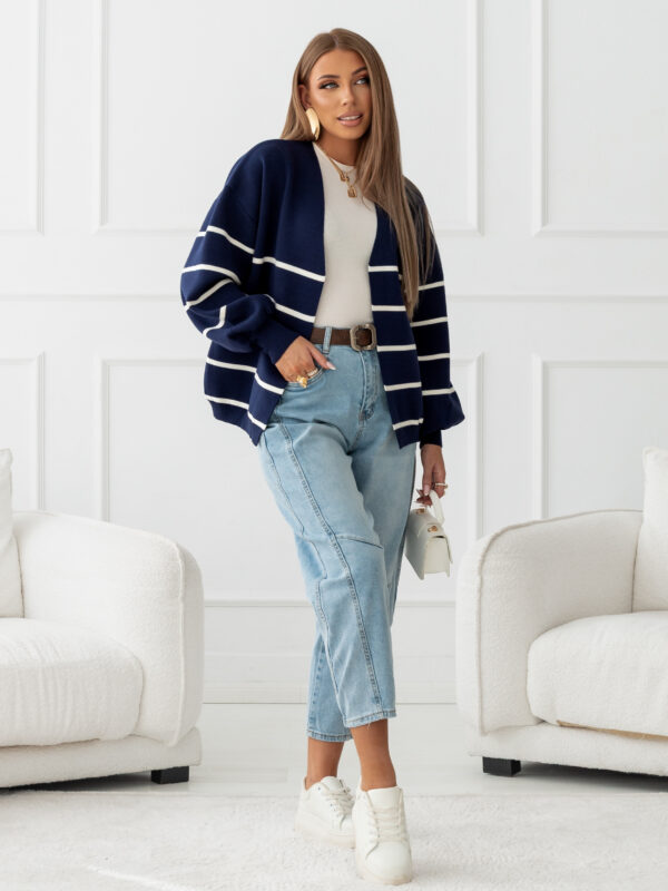 [if is_user_logged_in=off] Kardigan damski o luźnym kroju, wykonany z miękkiej dzianiny. Model bez zapięcia, z długimi rękawami zakończonymi ściągaczem. Wzór w delikatne, poziome paski. Fason typu…
