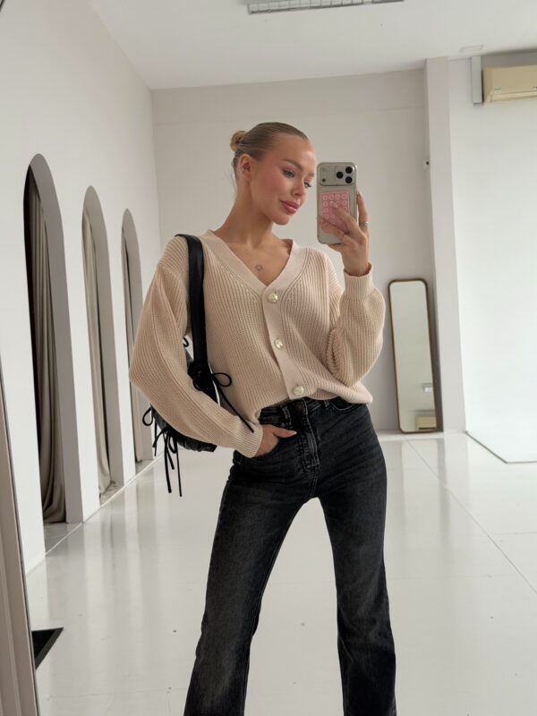 [if is_user_logged_in=off] Sweter o drobnym splocie oraz prostym kroju. Dekolt w kształcie litery V. Dół swetra zakończony ściągaczem. Zapięcie na złote, ozdobne guziki. Wyrób dziewiarski. Modelka ma…